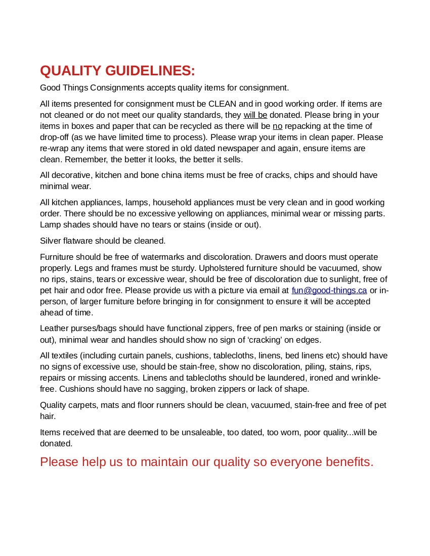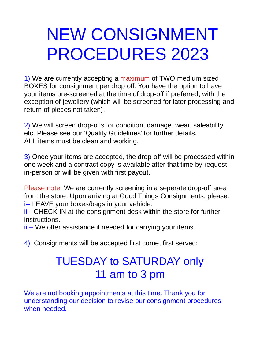 Drop in and experience "Good Things," you will be happy you found us. All goods consigned at 50/50. Prices based on research, experience and mutual agreement. Our appreciation to the consignors & the purchasers is heartfelt. Our staff are wonderful and knowledgeable.